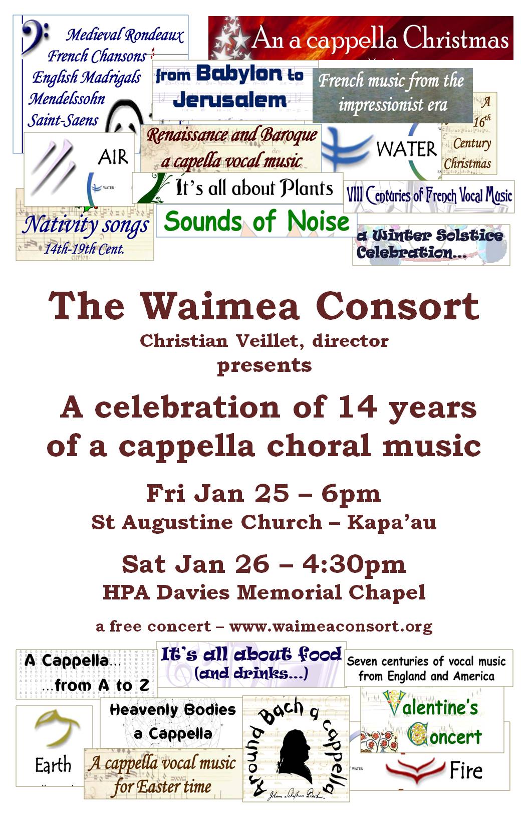 The Waimea Consort is an a cappella ensemble performing medieval, renaissance, baroque, romantic, and 20th century music. Since